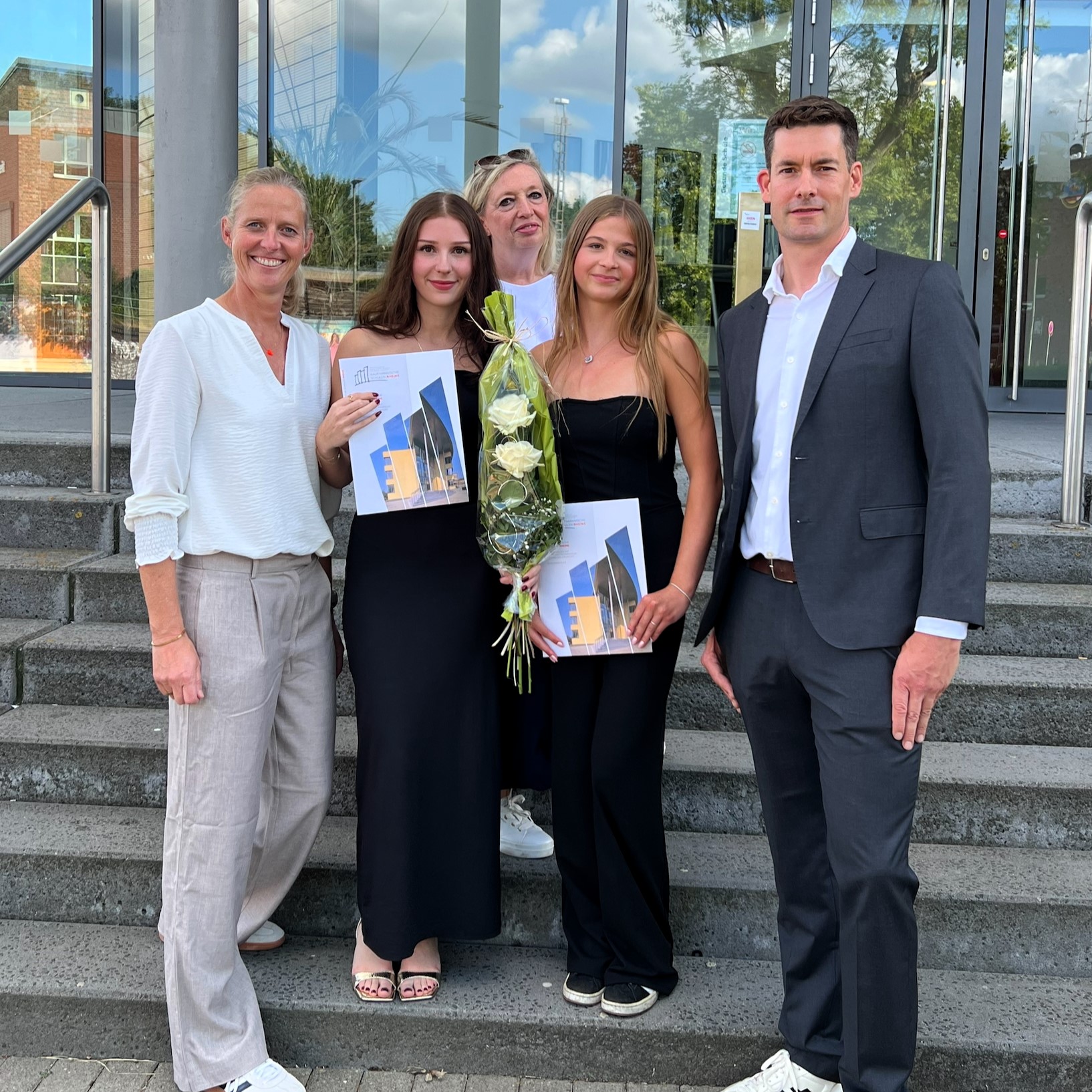 Bildungsgangleiterin Cathrin Fielers gratulierte Miriam Hodroj (Klasse HHO1 von Lehrerin Birgit Prümer) und Maeva Leilani Kotzian (Klasse HHO2 von Lehrer Karsten Holl) (v. links) zu ihrem hervorragenden Abschluss in der Höheren Handelsschule.