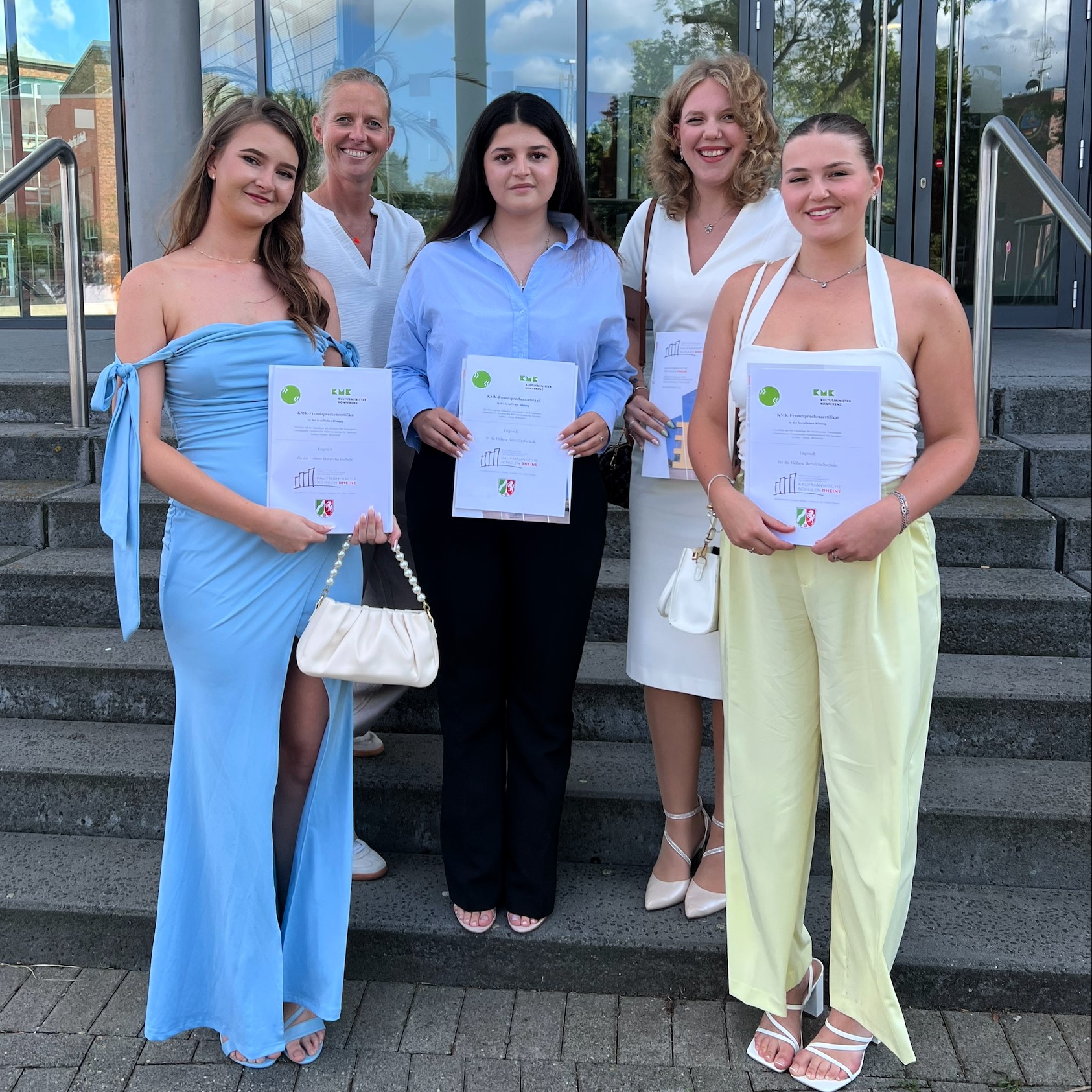 Ensara Dizdarevic erhielt aus den Händen von Bildungsgangleiterin Cathrin Fielers ihr KMK-Zertifikat. Ebenso Maria Kontalexi, Helen Kraft und Maike Brockmann (v. links).