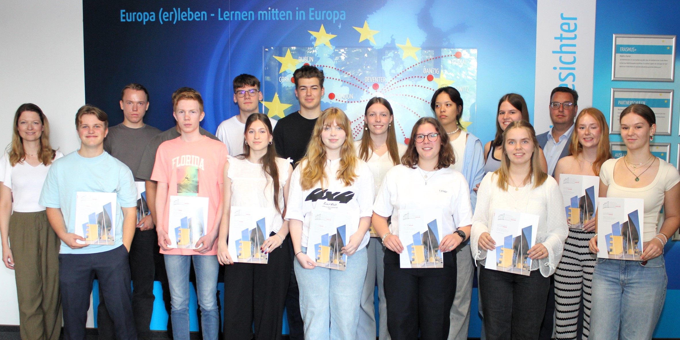 Saftige Wiesen, friedlich grasende Rinder, zerklüftete Küsten und klare Luft – so stellt man sich Irland, die ‚grüne Insel‘, vor. Im vergangenen März machten sich 18 Schülerinnen und Schüler aus der Jahrgangsstufe 12 des Wirtschaftsgymnasiums auf den Weg nach Dublin, um Land und Leute kennenzulernen. Und das ganz praktisch: Während eines vierwöchigen Praktikums schnupperten die Schülerinnen und Schüler der Kaufmännischen Schulen Rheine in die Arbeitswelt irischer Unternehmen oder öffentlicher Einrichtungen hinein. Für dieses Auslandspraktikum, gefördert im Rahmen des Erasmus+-Programms, bekamen sie jetzt von Schulleiter Tobias Raue und Lehrerin Sarah Baumann den ‚Europass Mobility‘ überreicht. Letztere hatte die Teilnehmenden im Vorfeld im Differenzierungskurs ‚Eurovisions‘ europa- und landeskundlich auf den Besuch der grünen Insel vorbereitet. Mit dem nun ausgehändigten Dokument erkennt die Europäische Kommission berufliche, interkulturelle und fremdsprachliche Erfahrungen im Ausland offiziell an. Zusätzlich gab es von der Schule das Zertifikat ‚Internationale berufliche Mobilität‘, welches die Bedeutung der Europabildung unterstreicht.