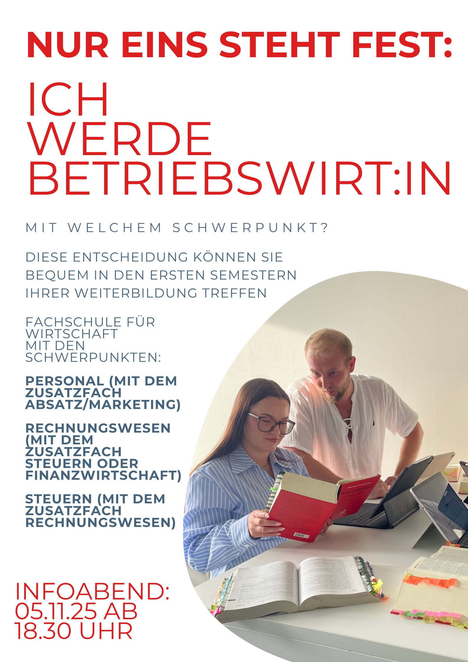 Die berufliche Weiterentwicklung und Karriere spielt auch für Sie in der Zukunft sicherlich eine große Rolle. Daher werden Sie sich – nach einer erfolgreichen kaufmännischen Ausbildung – noch für berufliche Weiterbildungsmöglichkeiten interessieren, um Ihre Chancen am Arbeitsmarkt zu erhöhen. Eine solche Möglichkeit mit unterschiedlichen Schwerpunkten bieten wir seit mehr als 20 Jahren mit der Fachschule für Wirtschaft, in der Sie nach 3 ½ Jahren in Teilzeitform (Schwerpunkte Rechnungswesen/Steuern/Personal) oder nach 2 Jahren in Vollzeitform (nur Schwerpunkt: Personalwirtschaft) den Abschluss zum „staatlich geprüften Betriebswirt“ erwerben können.