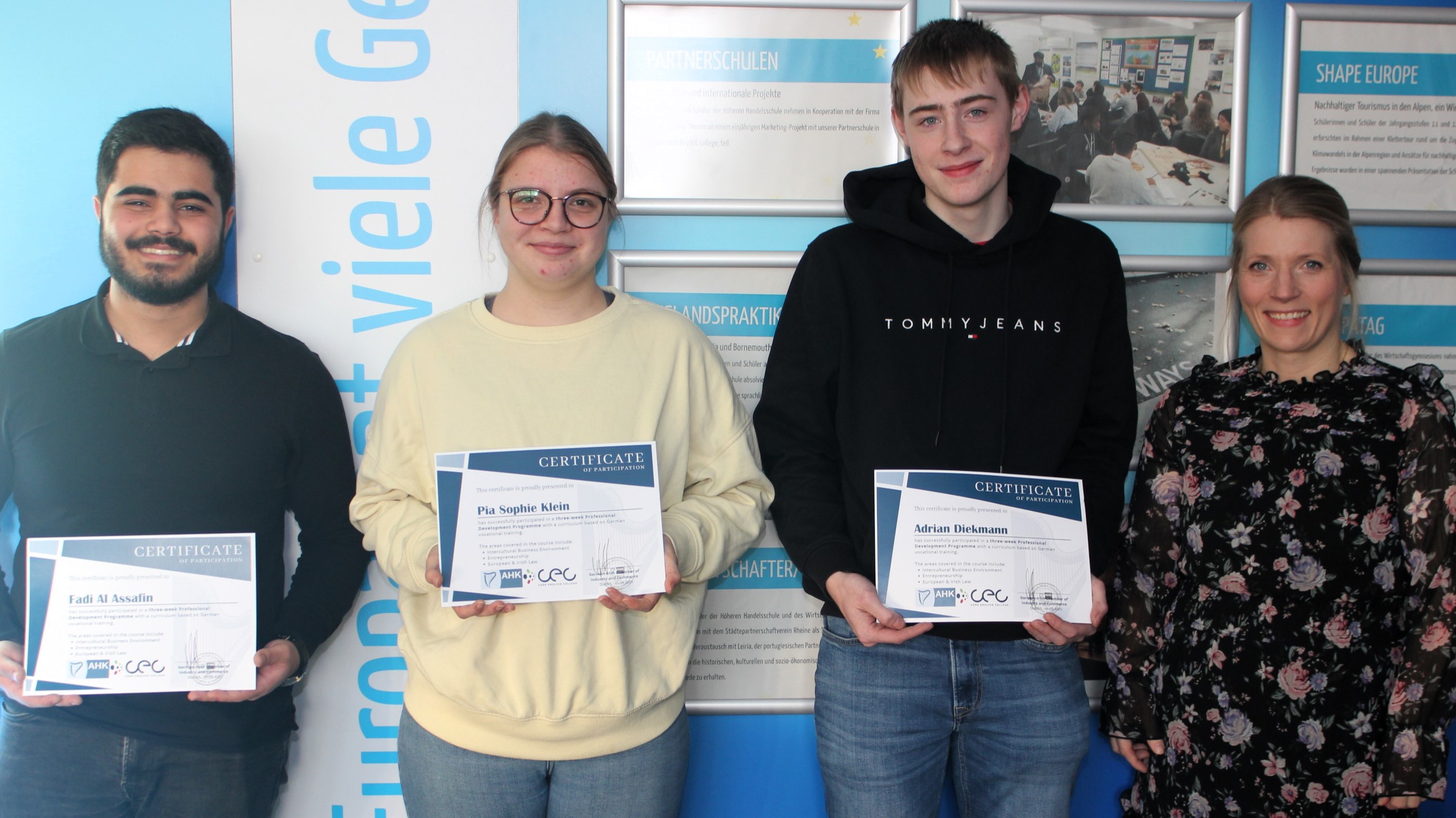 Fadi Al Assafin, Pia Klein und Adrian Diekmann erhielten von Lehrerin Kristin Gepting das „Kaufmann International Certificate“ der Deutsch-Irischen Industrie- und Handelskammer (von links, auf dem Foto fehlen Joèl Rozbicki, Albert Seldenreich und Alina Wiechers).