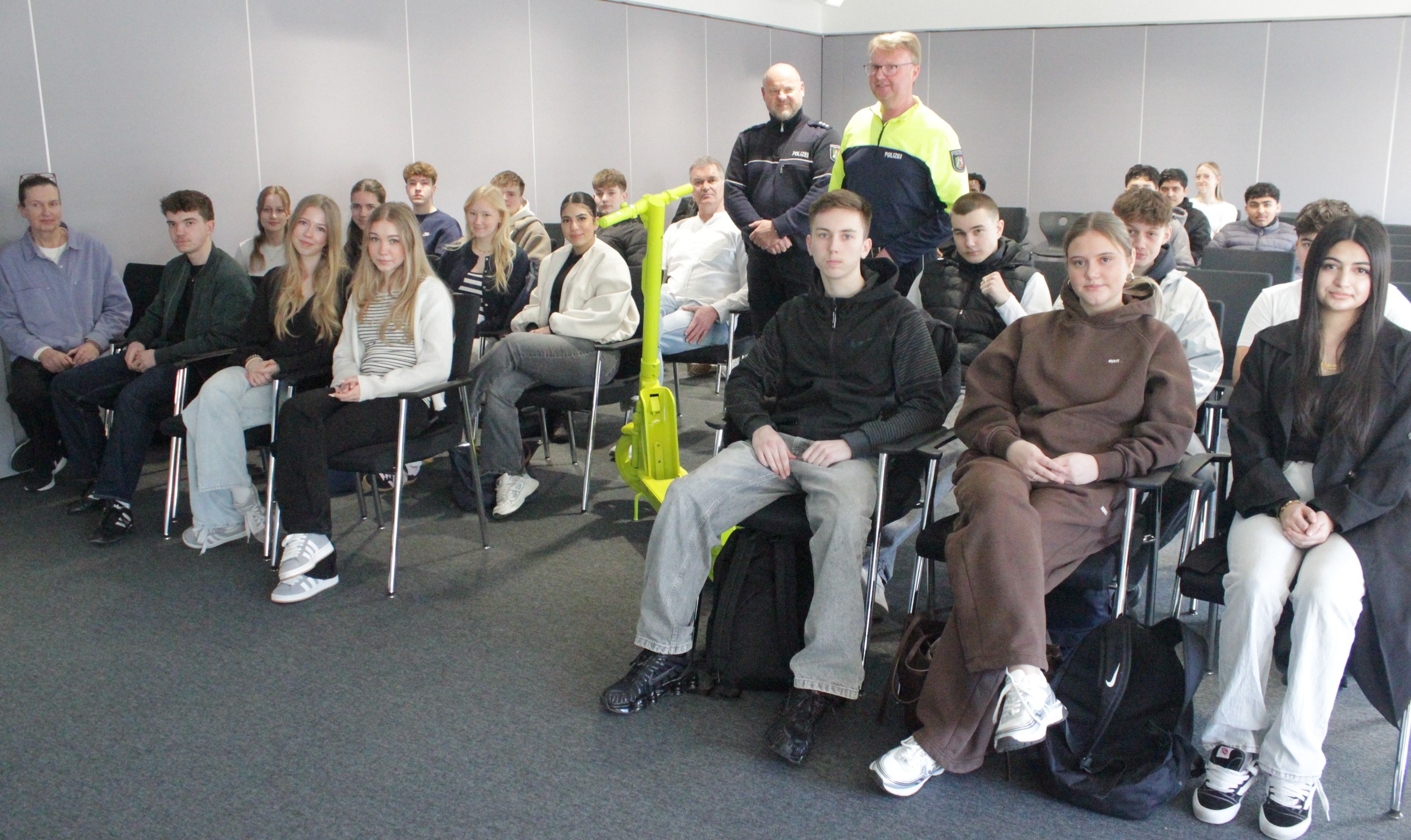 Der quitschgelbe E-Scooter zieht die Blicke im Mehrzweckraum auf sich: Die Beamten Andreas Kröger (li.) und Markus Tappe geben Hinweise für das sichere Fahren, aufmerksam hört auch Thomas Miethe (sitzend, li. neben Kröger) zu, der in jedem Jahr die Verkehrssicherheitswochen organisiert.